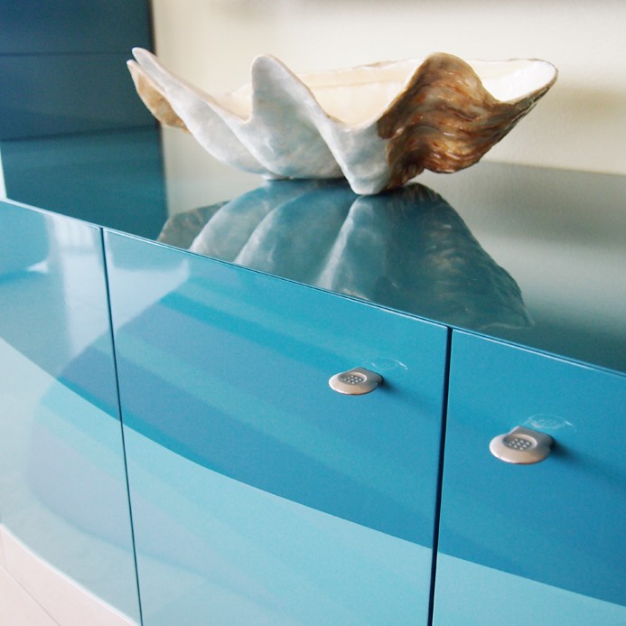 We partnered with a renowned local Interior Design Firm to build unique furnishings to complement architecture and interior styling for this secluded Blue Mountain Beach retreat. In addition to building custom bathroom and pool house cabinetry, we designed and built several pieces for the main house. The highlight of these are a 12-foot natural oak dining table, slightly convex to invoke a sailing vessel, with a matching linen credenza. The cherry wood curio cabinet with glass shelves, interior lighting and magnetic closure artfully showcases the owner’s shell collection. We also built a lakeside utility sink and cabinet, plus storage deck box, using teak and marine-grade magnetic closures.